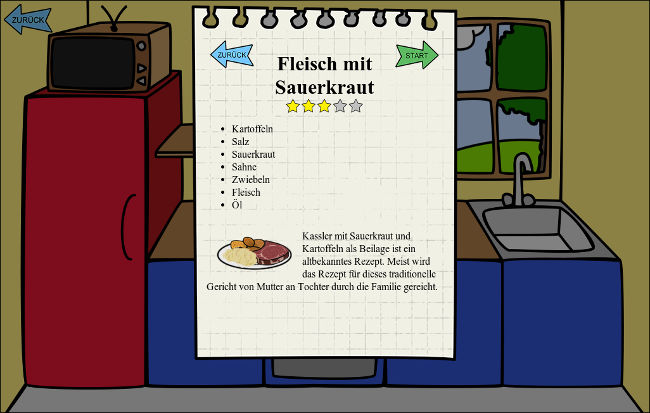 The project "Kitchen" was part of our second semester at the Hochschule Bremen in Media Computer Science (Medieninformatik). The goal was to create an interactive, multimedia kitchen based on JavaScript and the canvas-element of HTML5. The project uses HTML, CSS, JavaScript (and AJAX). Our Kitchen has the topics the elderly and comic - we choose to concentrate on the comic aspect.