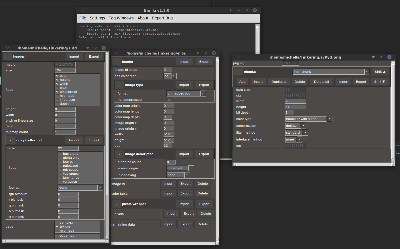 Binilla is a universal, GUI based, binary structure editor for supyr_struct. Binilla is capable of generating editing interfaces for any binary structures defined with the supyr_struct library. Meta data can be embedded into the supyr_struct descriptors to customize the way Binilla displays the structures. This includes specifying custom widgets, field value ranges, visibility of fields, whether a field can be edited, comments, tooltips, field units, and more.