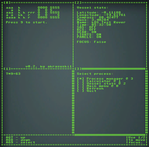 Unfortunately, this thing does not work for now - this is because of lib_exec is not working in current version of kOS, and akrOS was heavily relying on that functionality. Probably this project will be stalled until the new version of kOS is released - as I heard, it will have delegates ("function pointers"), which will enable me to make this thing worka gain (albeit with a lot of rewriting).