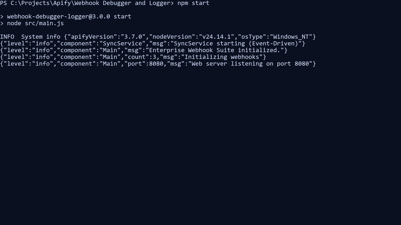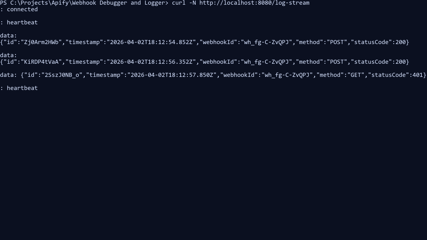 webhook-debugger-loggerThere is also a dedicated standalone image target in Dockerfile via --target runtime-standalone. For a fuller local validation flow, including SSE verification, see docs/local_docker_testing.md.