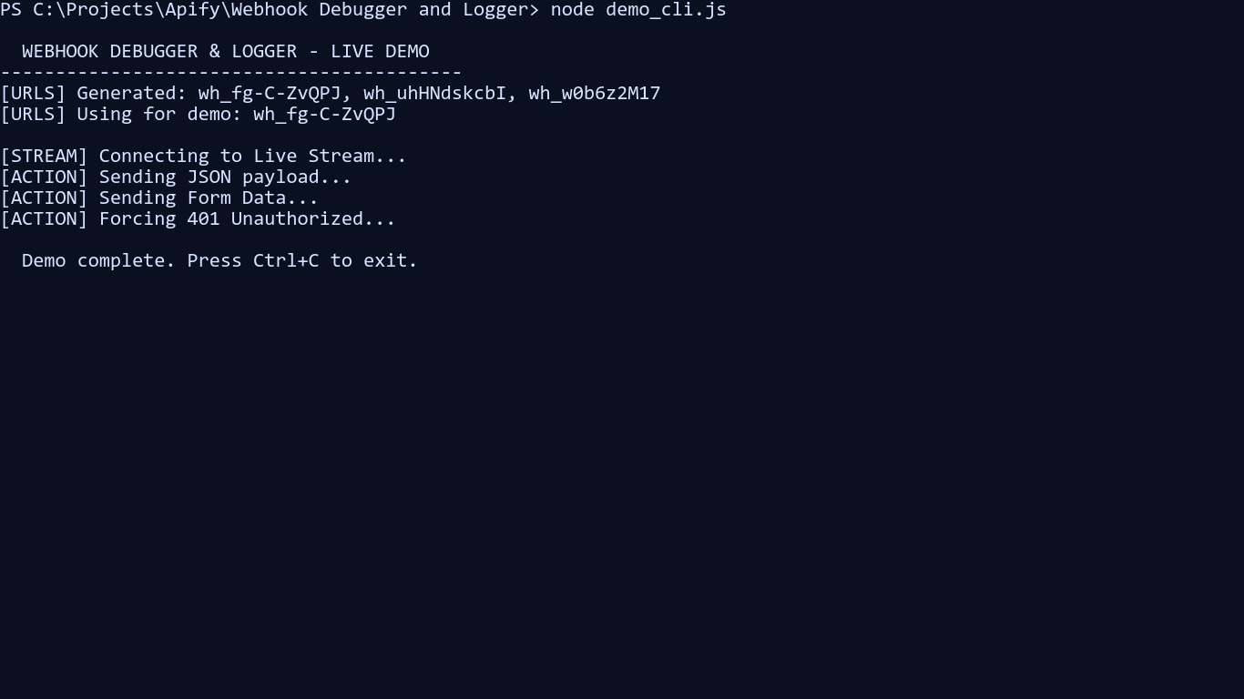 Webhook Debugger, Logger & API Mocking Suite is an Apify Actor for testing webhook integrations end to end. It generates temporary endpoints, captures the full request envelope, exposes live and queryable logs, and lets you replay or forward captured traffic to another destination.