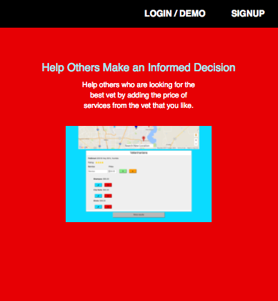 This web app helps people to find the prices of veterinarian services around a location of their choice. My sister told me that every time she moved, one of the first thing she would do is find a veterinarian. She always had difficulty comparing the prices of their services. After researching, I found that not very many veterinarians post their prices on their websites, so I made this app to help pet owners have access to more information in order to compare different veterinarians in their desired location.