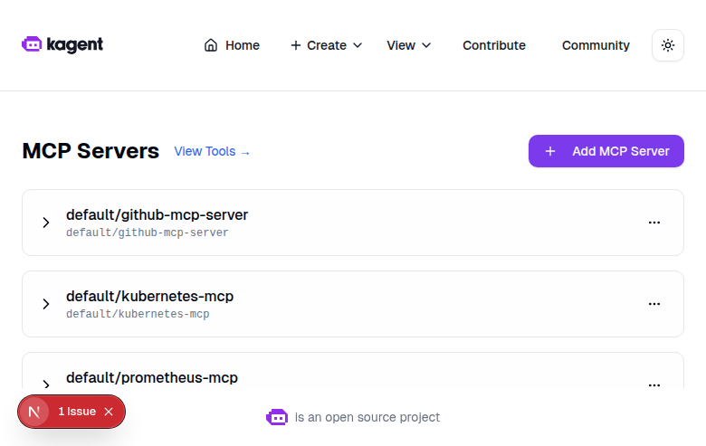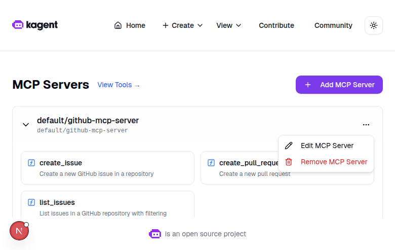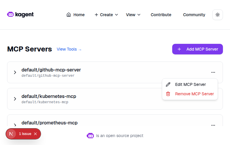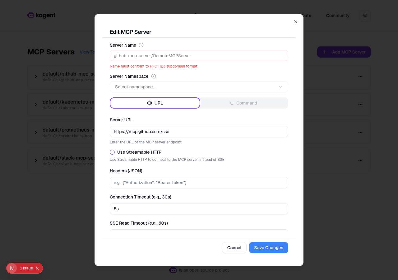 Updated Screenshots: Edit Button for Tool ServersFresh screenshots from a running kagent UI dev instance (Next.js 16, 1280x900 viewport) with mock backend data. 1. MCP Servers List PageFour configured MCP servers displayed with expand/collapse and action menus. 2. Dropdown Menu with Edit OptionThe three-dot menu now includes "Edit MCP Server" (pencil icon) alongside "Remove MCP Server" (trash icon). 3. Edit MCP Server DialogClicking "Edit" opens a dialog pre-filled with the server's current configuration: name (read-only), URL, protocol toggle (SSE/Streamable HTTP), headers, timeouts, and terminate-on-close setting. "Save Changes" button submits the update. Flow: Servers page -> Click ... menu -> "Edit MCP Server" -> Dialog with pre-filled values -> Edit & Save. |