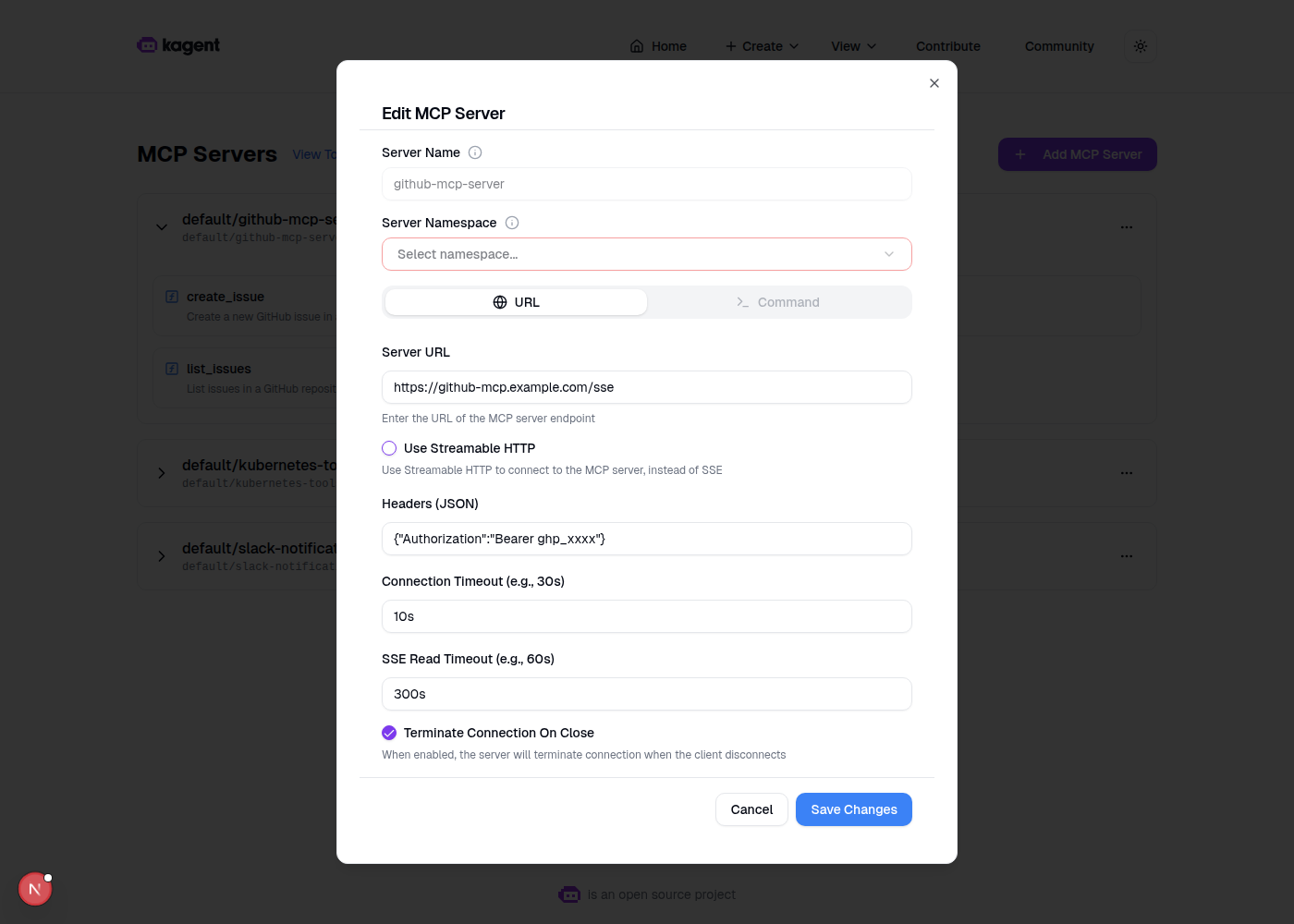 Visual Proof: Edit Button for Tool Servers (PR #1303)Screenshots captured from a running kagent UI dev instance with mock backend data. 1. MCP Servers List PageShows the servers list with 3 configured servers (GitHub MCP, Kubernetes Tools, Slack Notifications), each showing their discovered tools count. 2. Expanded Server with ToolsServer expanded to show discovered tools (create_issue, list_issues, create_pull_request). 3. Dropdown Menu with Edit OptionThree-dot menu showing "Edit MCP Server" (pencil icon) and "Remove MCP Server" (trash icon) options. 4. Edit MCP Server DialogFull edit dialog pre-filled with server data: URL, authorization headers, timeout settings, SSE read timeout, and terminate-on-close toggle. Title shows "Edit MCP Server" and submit button shows "Save Changes". |