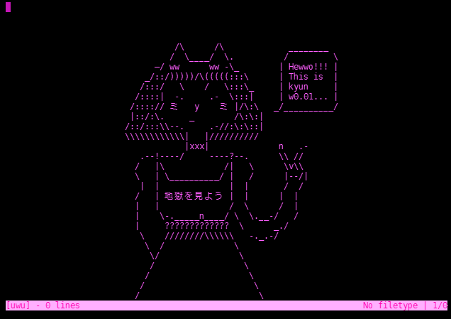 Kyun is a low productivity, low fidelity, low customizablity text editor that has its focus firm on user discomfort - specifically made for writing uwu-style cutesy text. It is based on , a great text editor for learning purposes, by Philipp Flenker and licensed under CC BY 4.0.