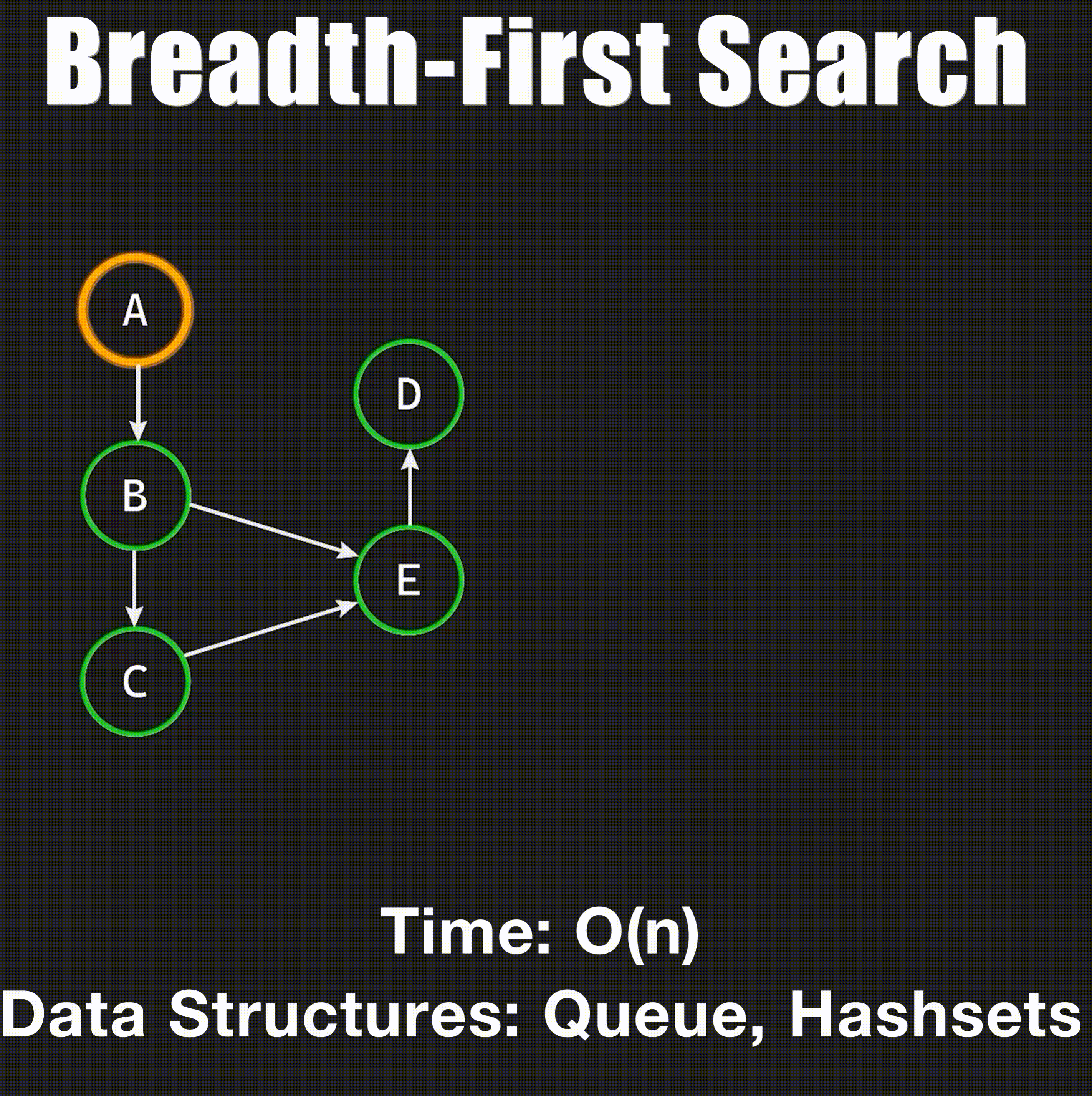 Prioritizes breadth first. It explores all possible neighbors of a vertex before moving on to the next level of neighbors, sometimes also called layers. This uses a queue and a hash set, and can be used to find the length of the shortest path from one vertex to the other.