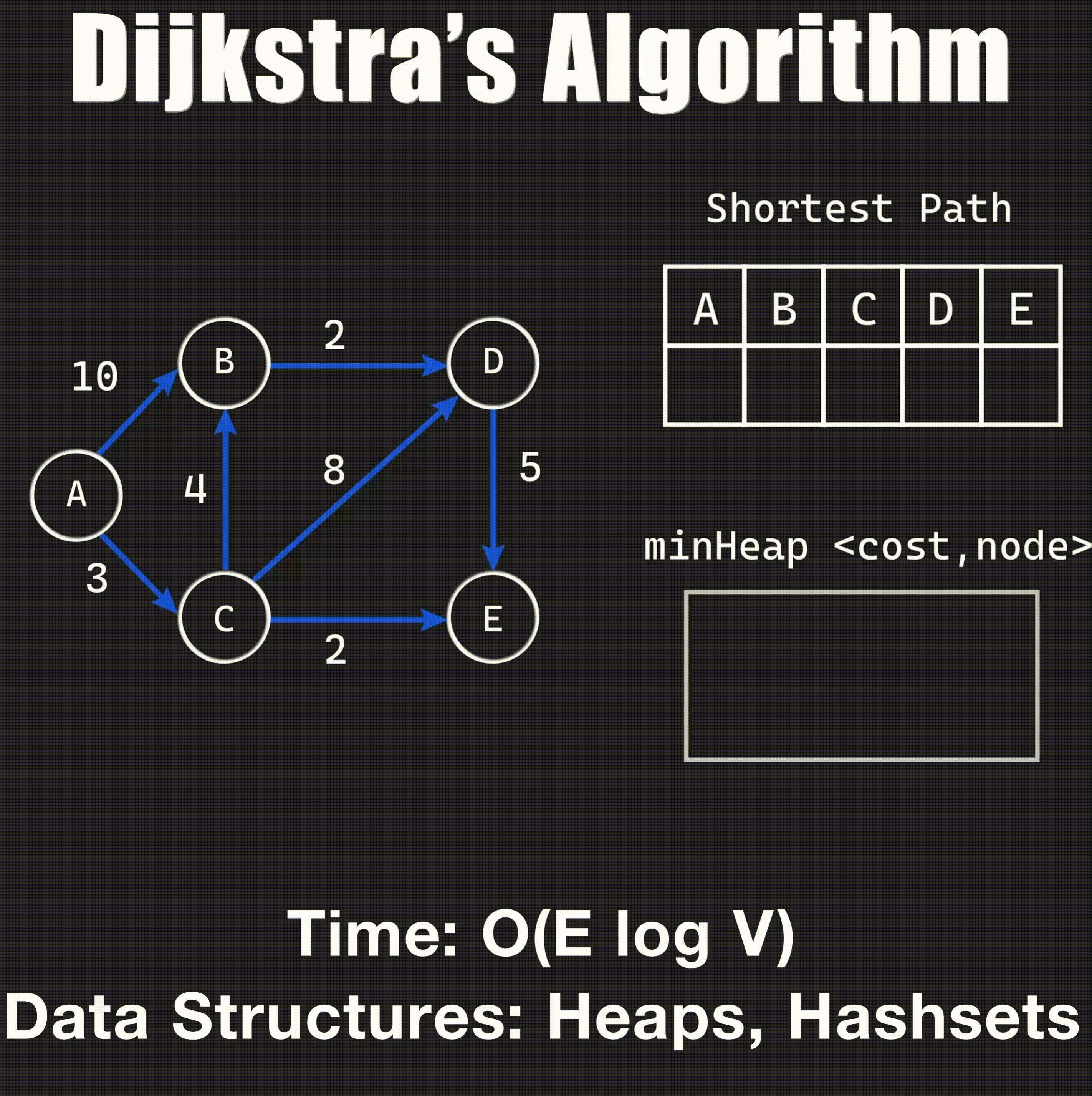 A greedy algorithm that operates on weighted graphs, used to find the shortest path from one source to all other vertices in the graph. It uses a min heap to pick the shortest path at each step and a hash set to avoid cycles.