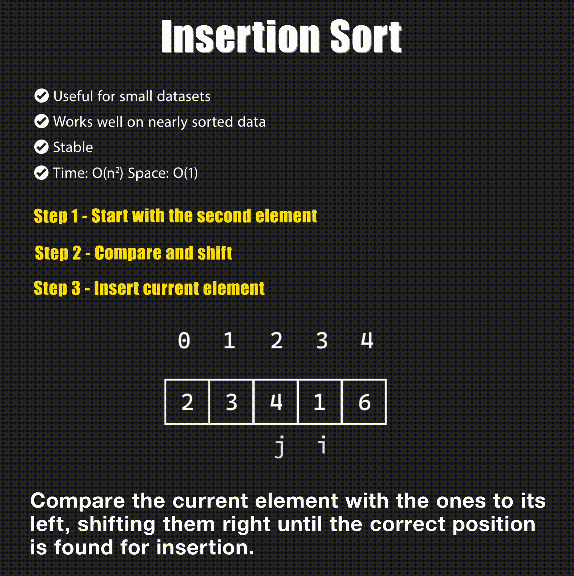 It sorts the array by inserting each element into its correct position. At any point, the left side of the array is sorted while the right side is unsorted. We choose the first element in the unsorted array and insert it into the sorted array in the correct position. We then repeat this process for the next element in the unsorted array.