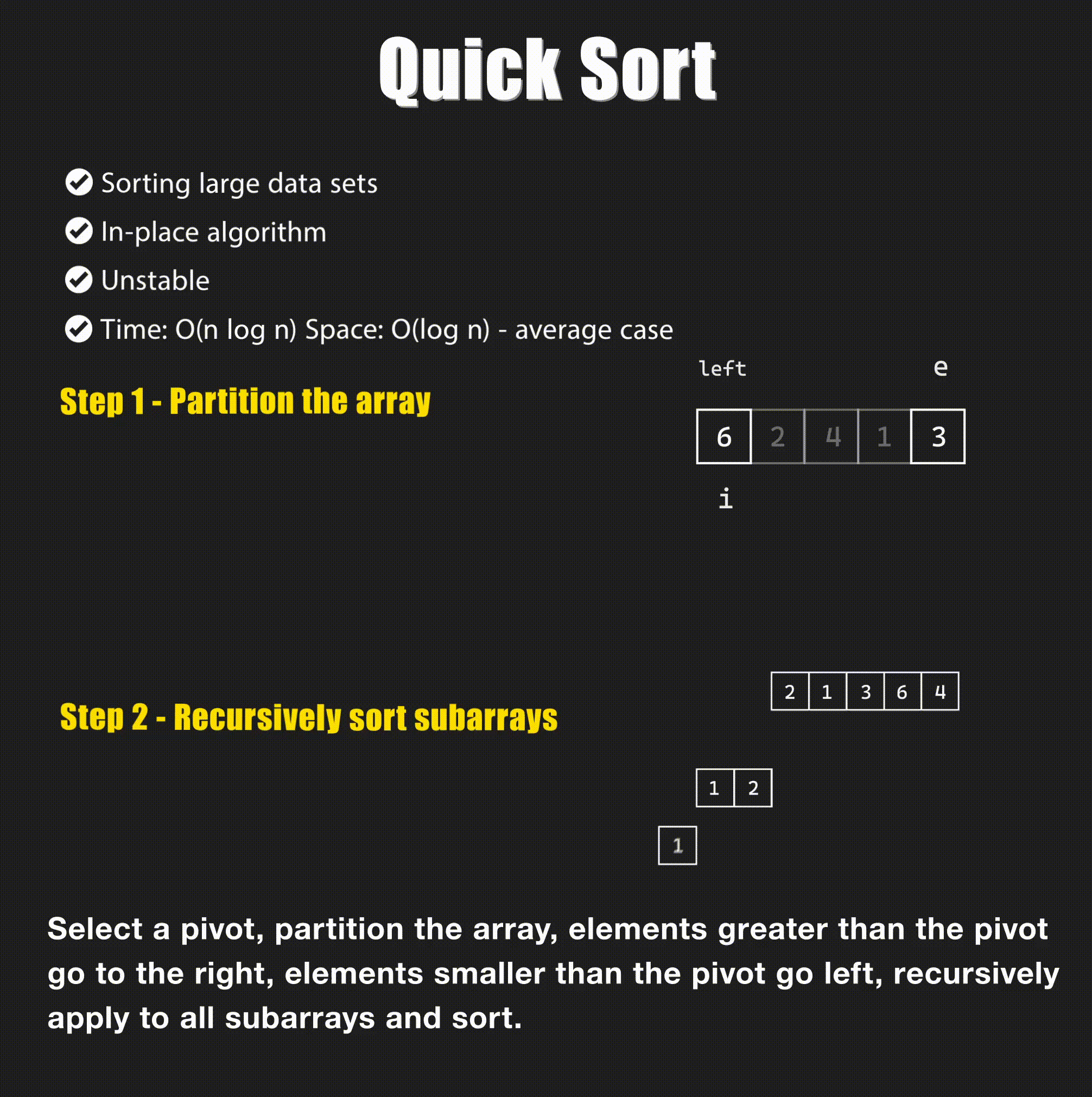 Quick sort is a divide and conquer algorithm that picks an element as pivot and partitions the given array around the picked pivot.