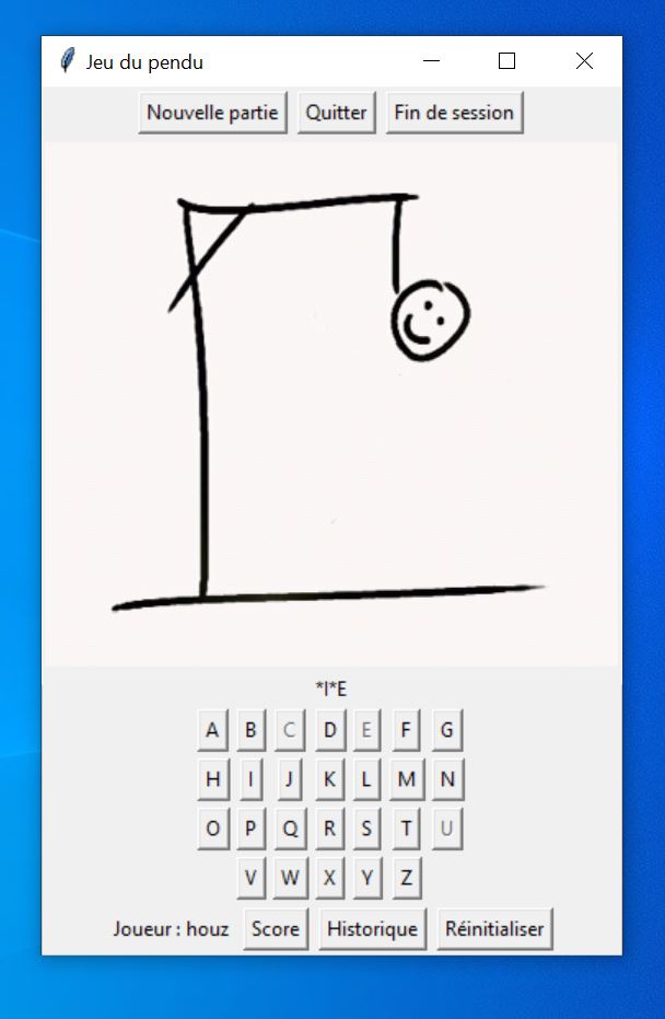 Hangman game Author : Akilhoussen Onaly Run the Jupyter Notebook to play Warning : make sure to install the following libraries : Tkinter (pip install tkinter) Pickle (pip install pickle) Screenshot :