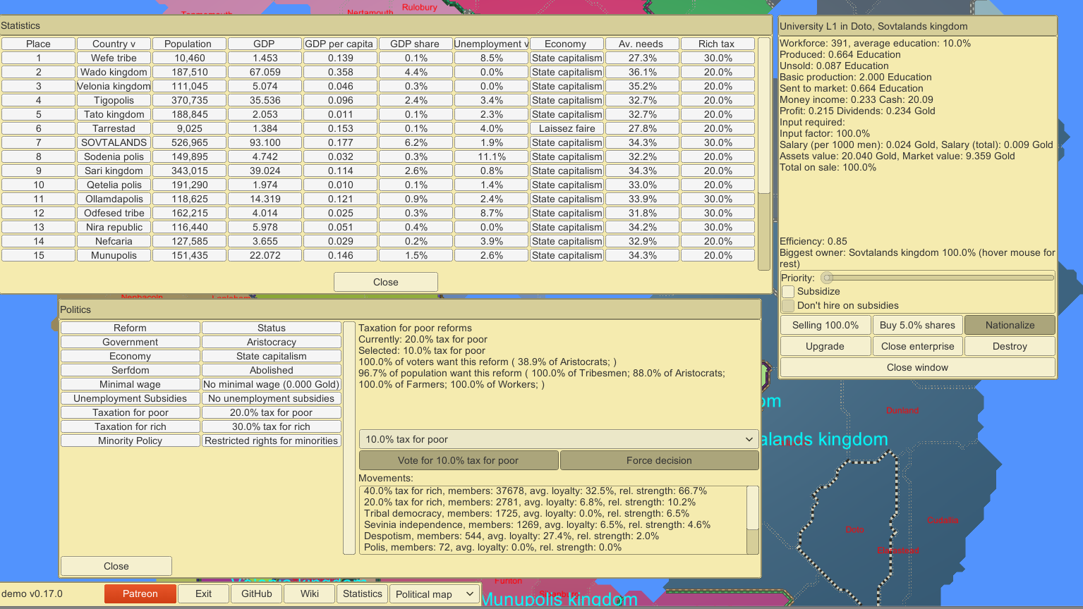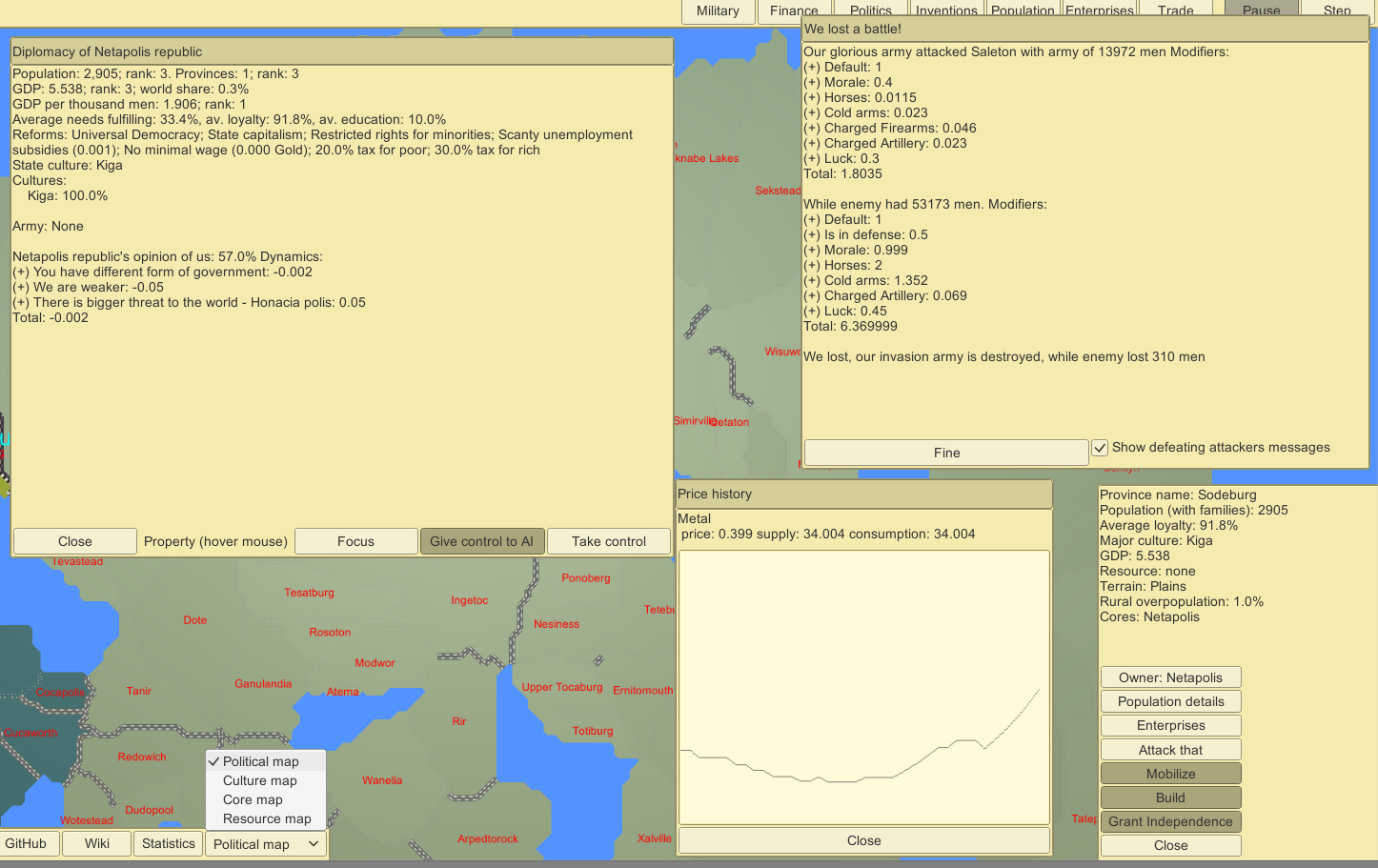 I'm a huge fan of the game Victoria 2, but I was disappointed in the economy mechanics of the game. Unable to find a strategy simulation game with a better economy, I decided to make my own. Main simulation principles in PosperityWars include: